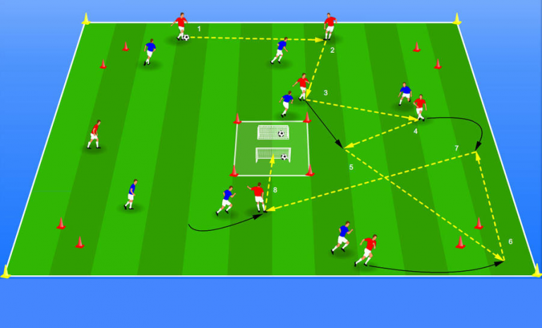 Inside the area, a 7 vs 7 game will be played. When a team completes 10 consecutive passes, it is allowed to score in one of the goals located on the playing area.