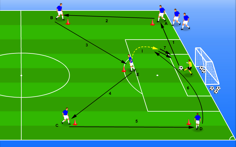 Player D crosses the ball to player E (6), the player attacks the ball (III) and completes the action with a shot on goal (7).