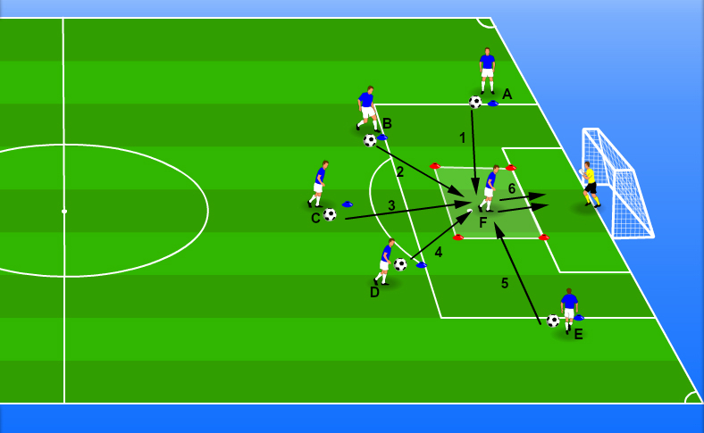 Player A comes on the run (II) and completes the action with a goal kick (5)