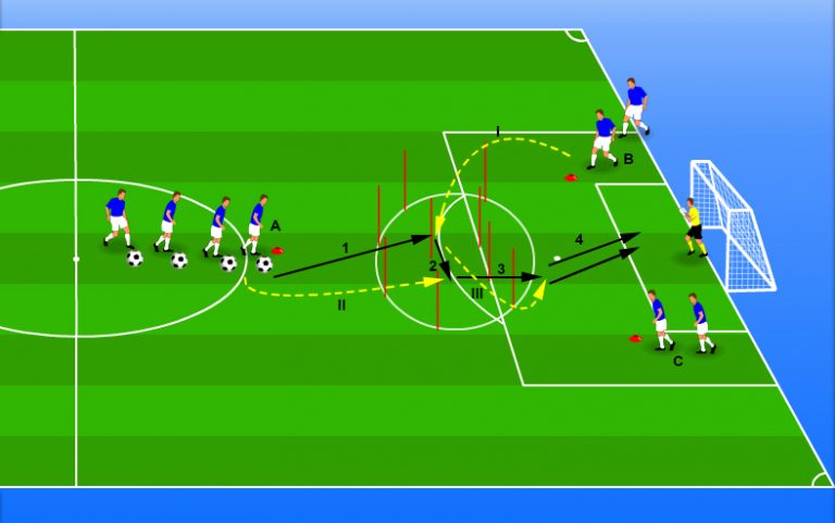 Player B dribbles through the poles (2) and then plays a forward pass to player A (3) into space (II).