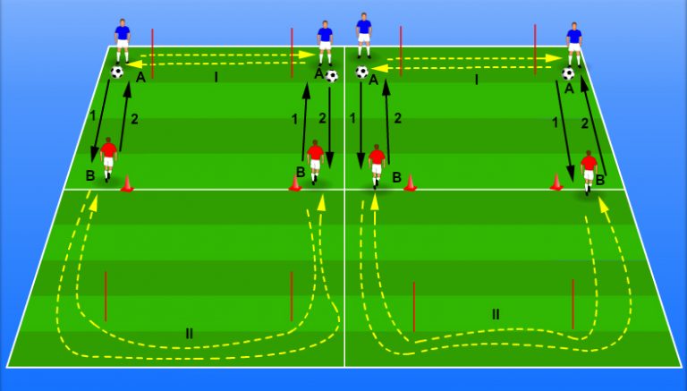 The working area is set up as shown in the picture, with each player A in possession of a ball.