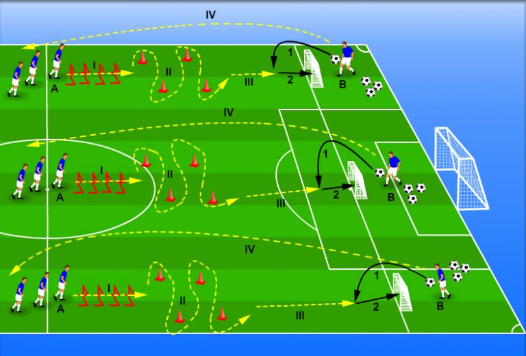 Once they reach the area in front of the goal, players A receive a pass from players B and must shoot directly at the goal before the ball touches the ground (1, 2).