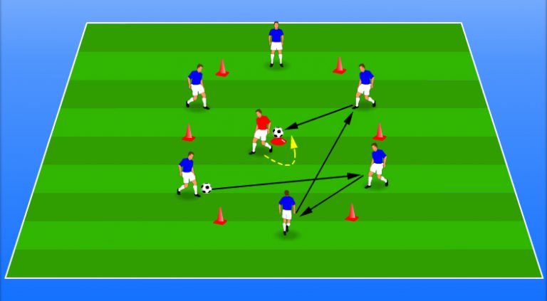 Using cones, a circle will be created. Between these cones the players will be placed (the players between the cones will have a ball).