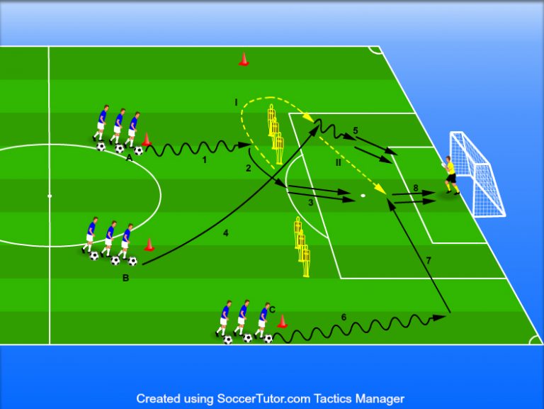 Player A goes around the slalom poles (I), receives the ball from player B (4), takes possession, and finishes with a shot on goal (5).