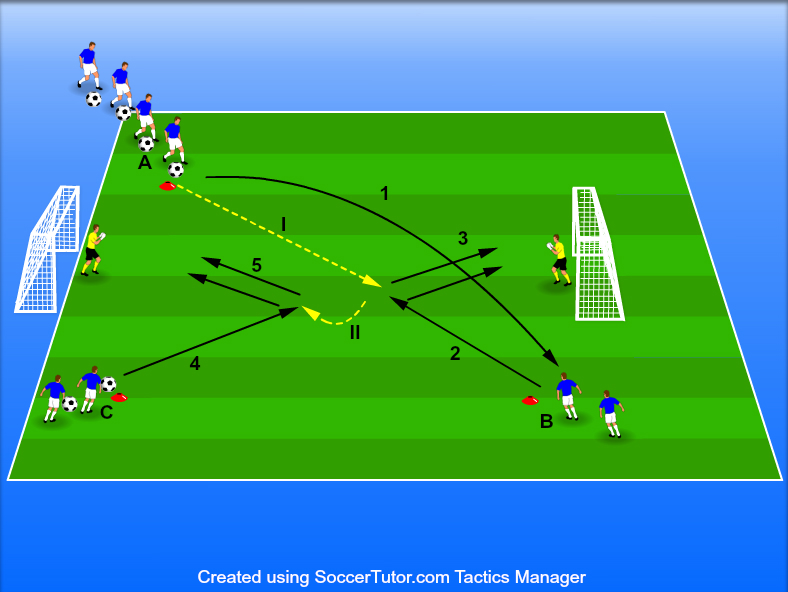 A work surface will be made with a distance between the goals of about 30 - 35 metres. Players A and C will have balls in their possession.