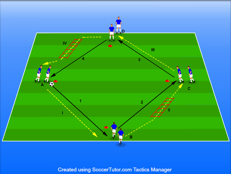 Player D passes the ball to player A (4) and then performs variations of the speed ladder exercise (IV).