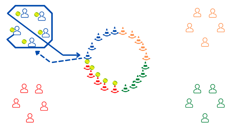 The first student from each team starts running, goes around their own team, reaches the designated cones, and places their tennis ball on one of them.